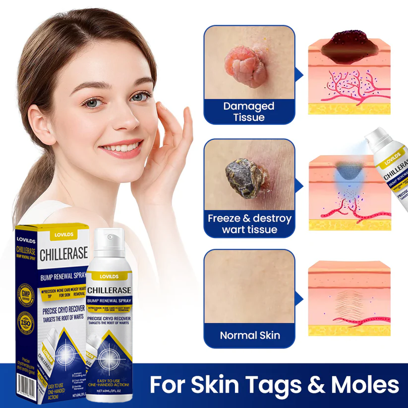 LOVILDS⢠ChillErase Bump Renewal Spray uses advanced Cryo-Cooling Renewal Technology to safely smooth and refine the skin â without irritation or downtime. Once applied, the cooling mist instantly lowers surface temperature, calming redness, tightening pores, and gently loosening hardened buildup beneath the skin.